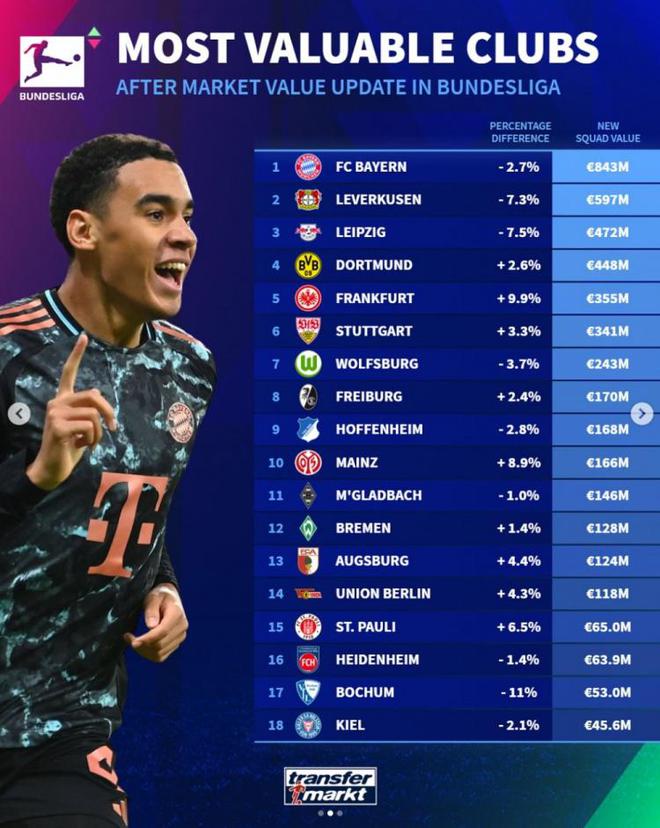 德甲球队身价排行:拜仁8.43亿欧居首,勒沃库森、莱比锡二三位