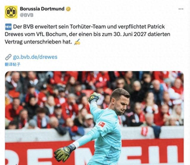 官方:多特蒙德签下波鸿门将德雷维斯,双方签约至2027年